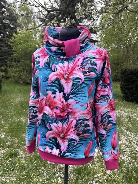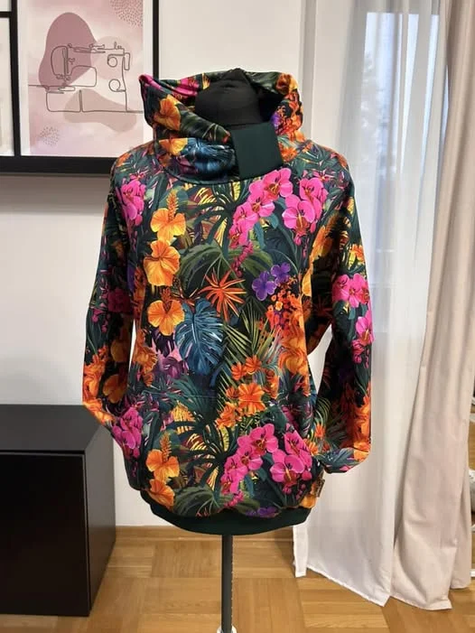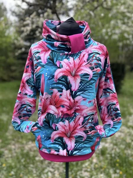 Bluza z kominem z ozdobnym paskiem, obniżoną linią rękawa. Do wyboru opcja z kieszeniami lub bez.