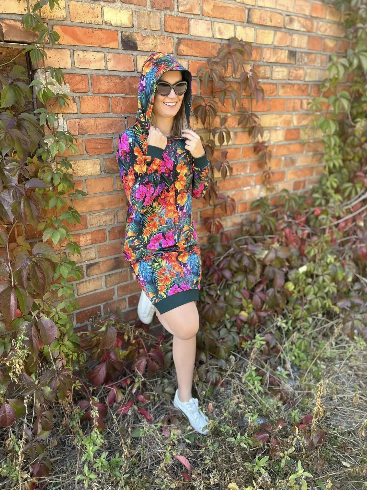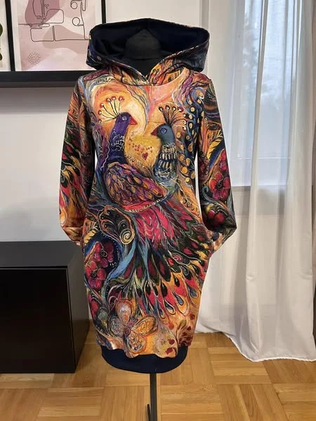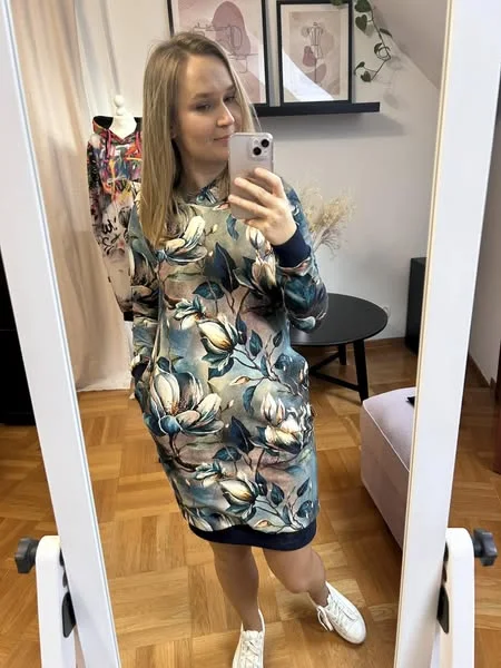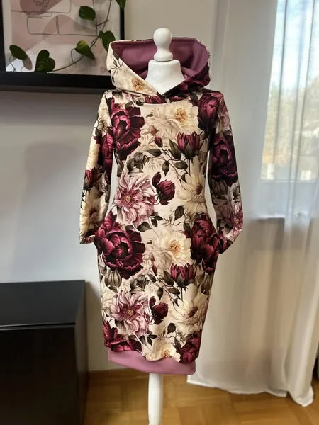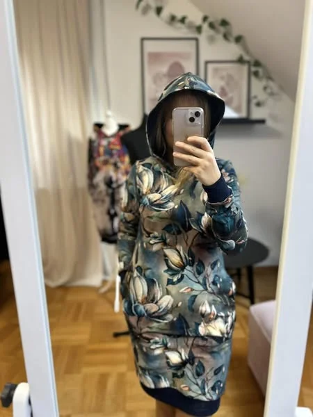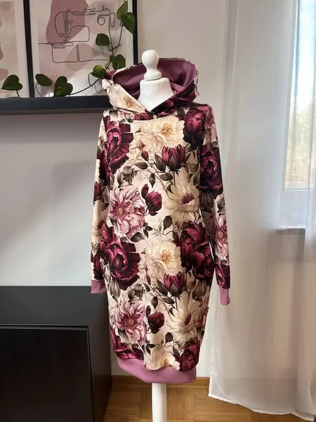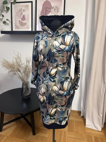 Bluza z kapturem, przedłużona do sukienki, wykończona ściągaczami, kieszenie w szwach bocznych, klasyczny długi rękaw, szyta z dresowki pętelki.