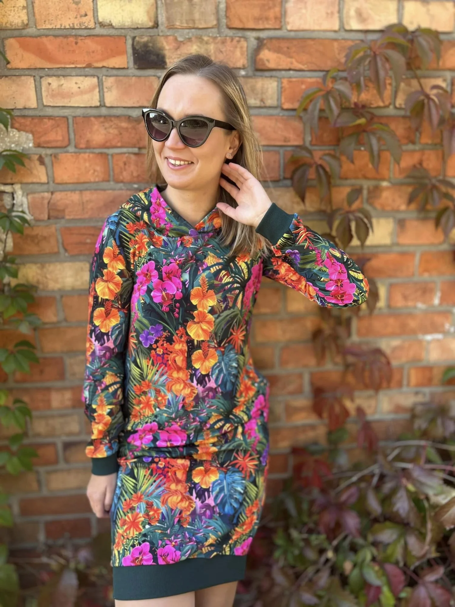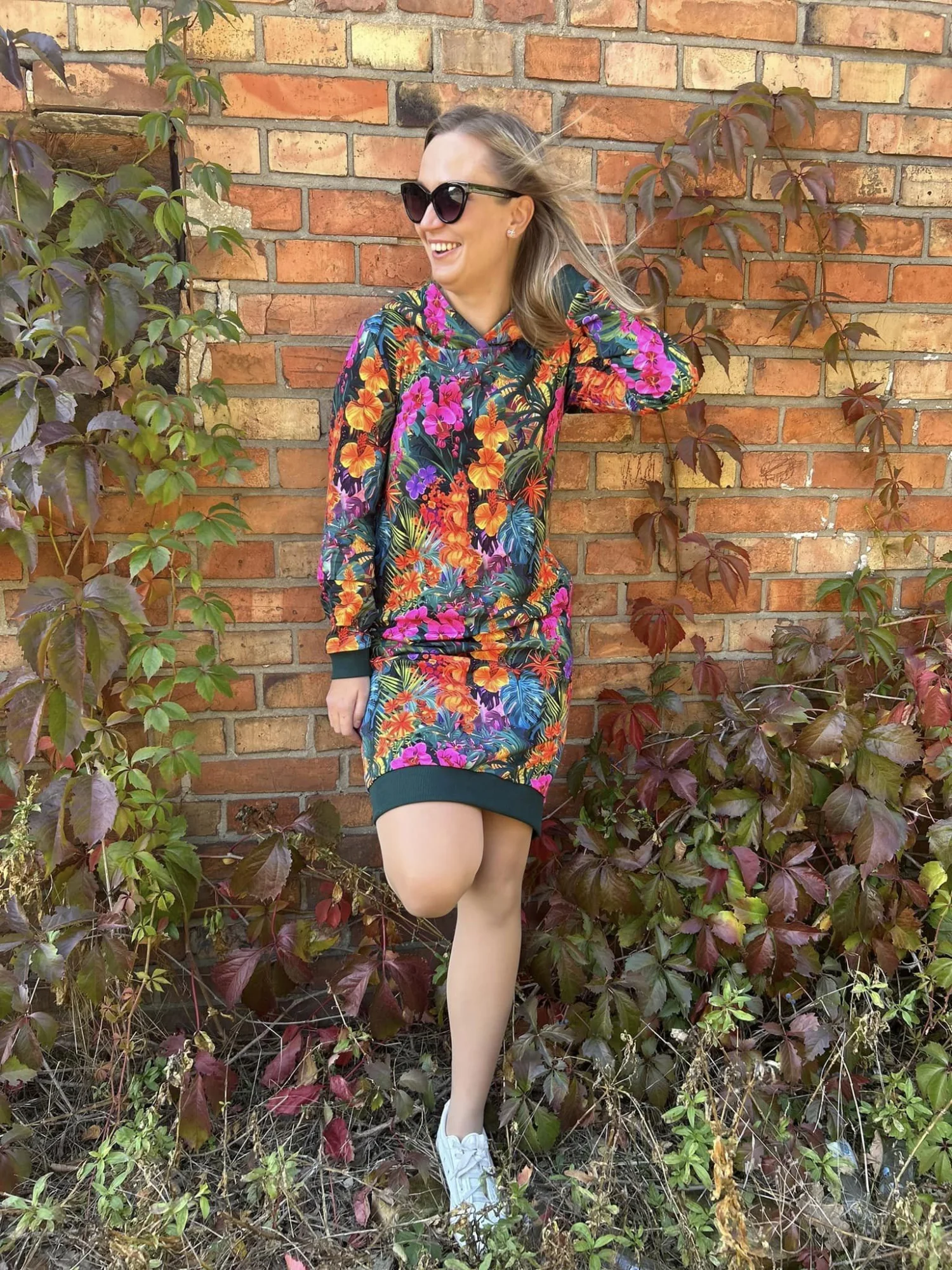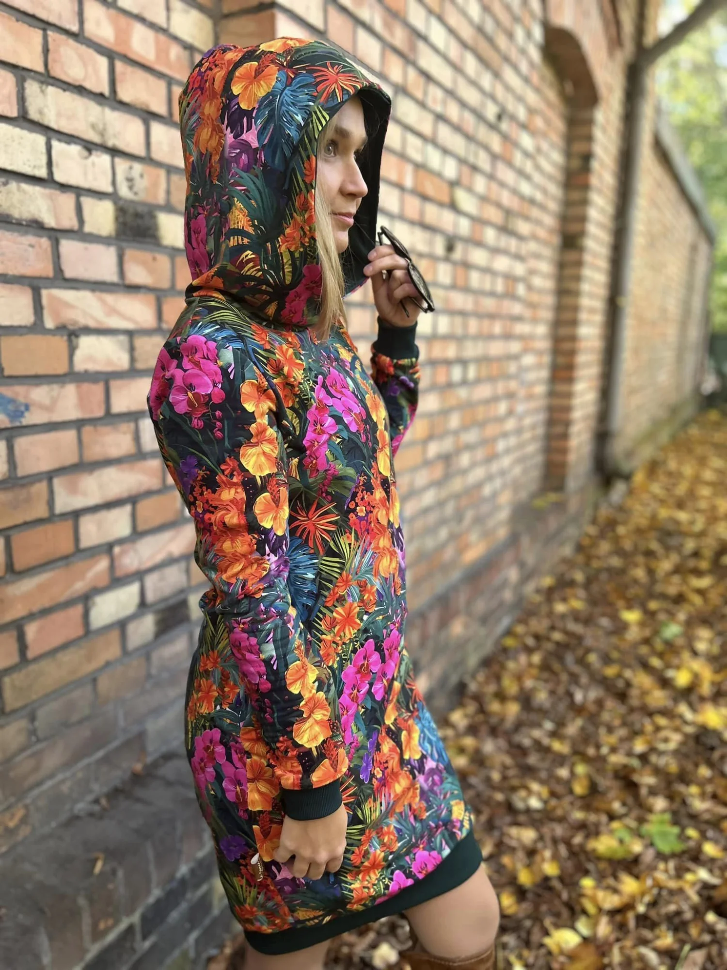 Bluza z kapturem, przedłużona do sukienki, wykończona ściągaczami, kieszenie w szwach bocznych, klasyczny długi rękaw, szyta z dresowki pętelki.