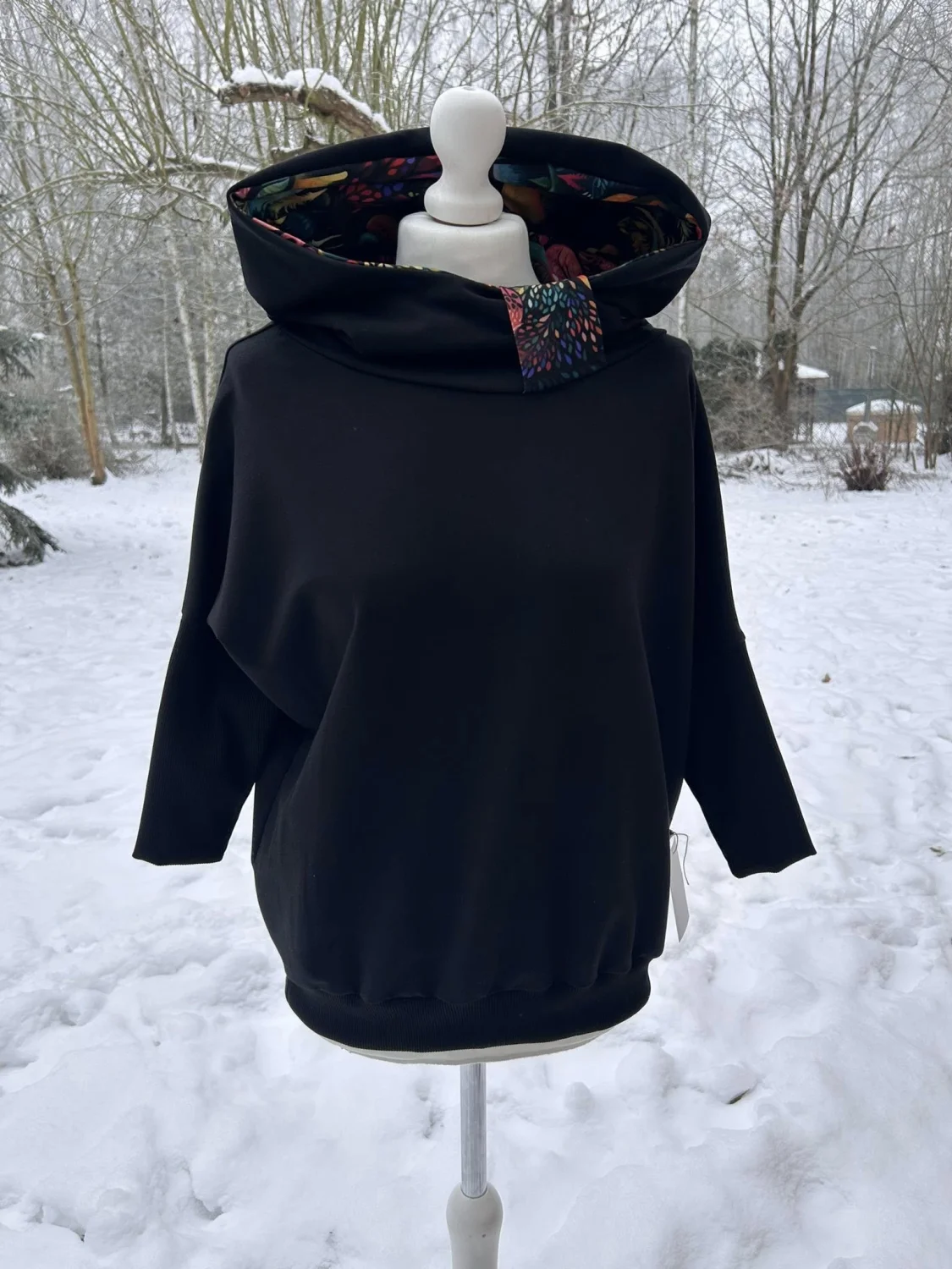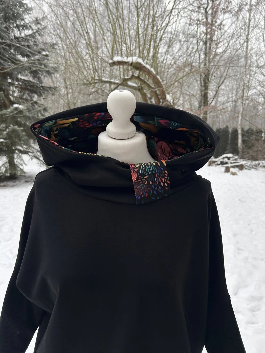 Oversizowa damska bluza z efektownym, obszernym kapturem wykończonym ozdobnym paskiem.