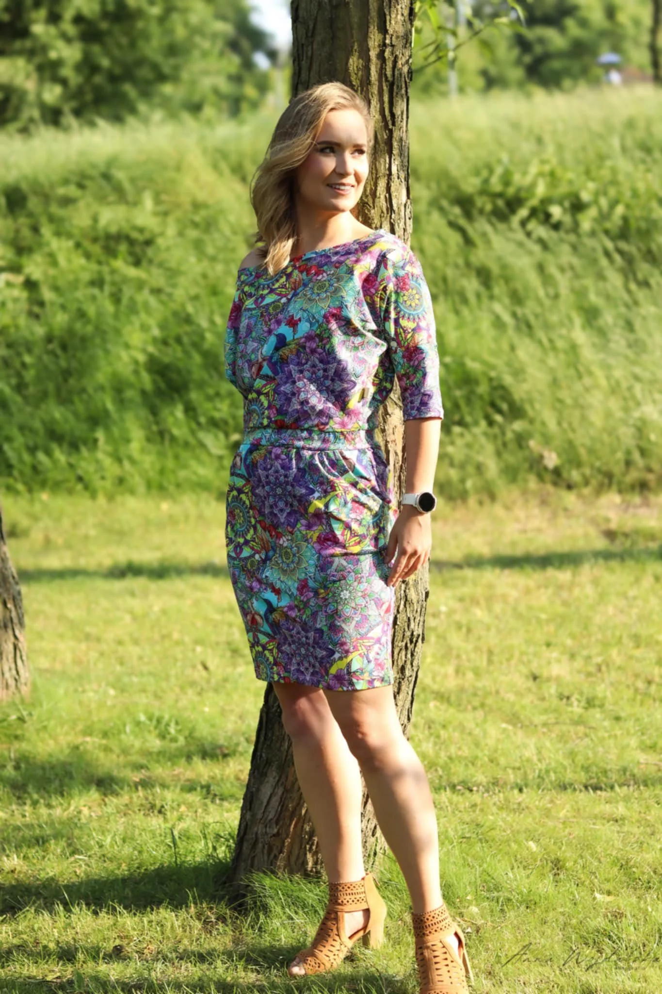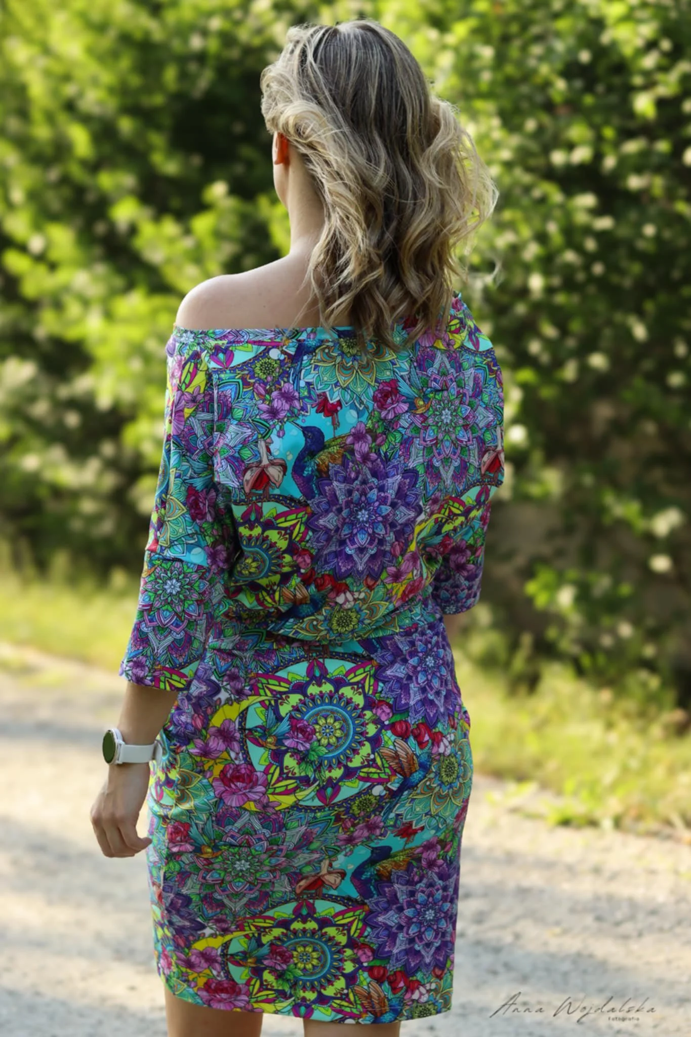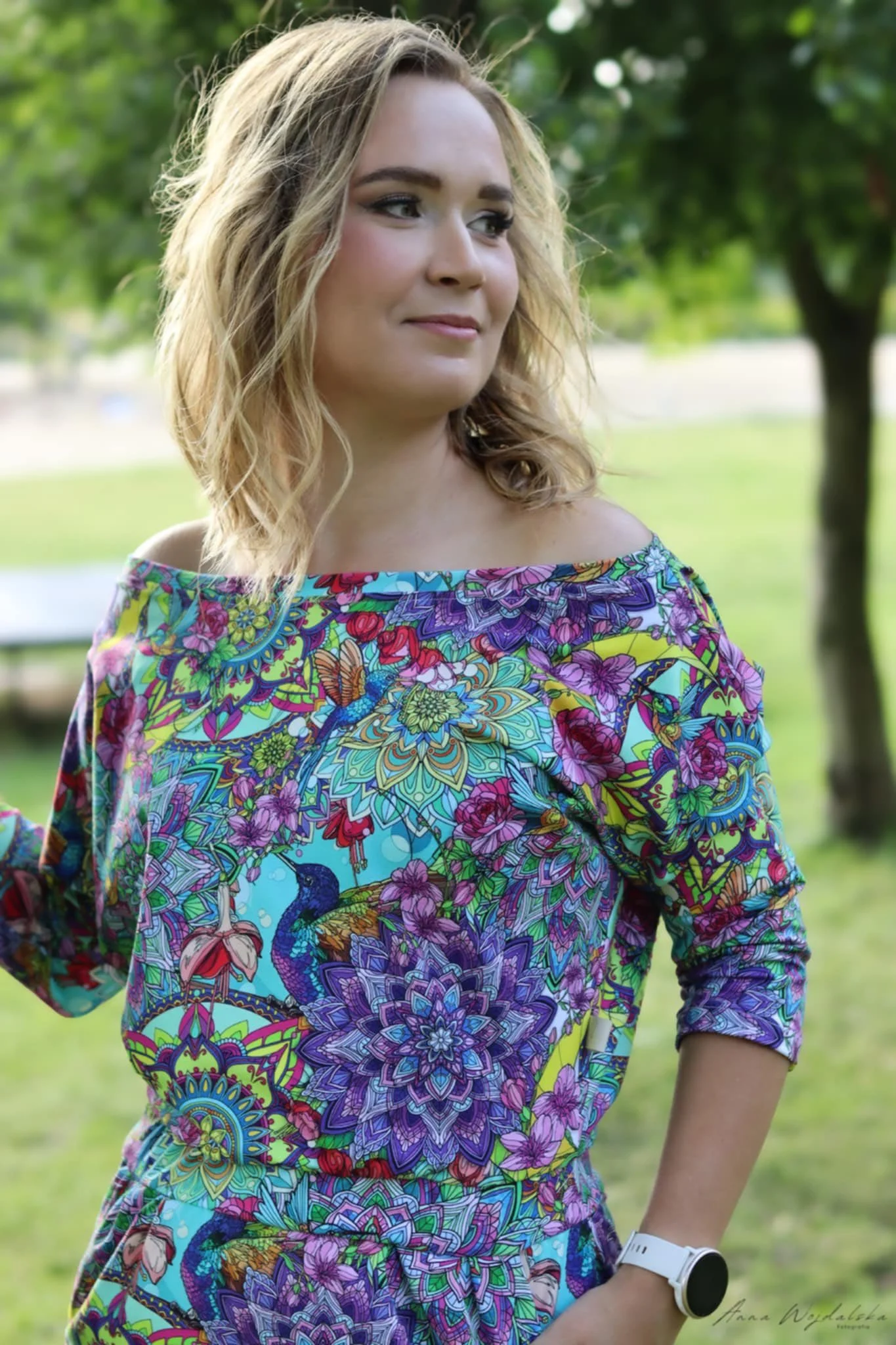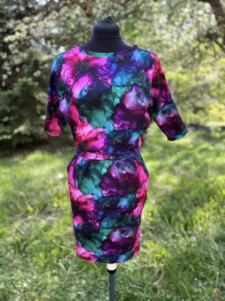 Góra jest luźna, dekolt w łódeczkę odsłania ramię (na życzenie może być mniejszy), rękaw 3/4, w pasie gumka, dół ołówkowy z zakładkami.
