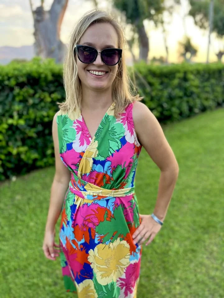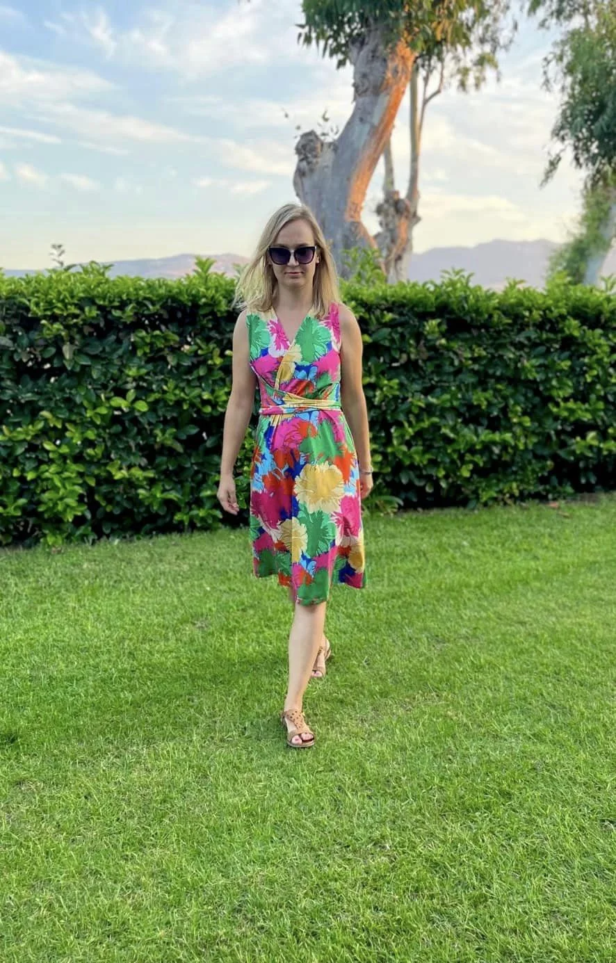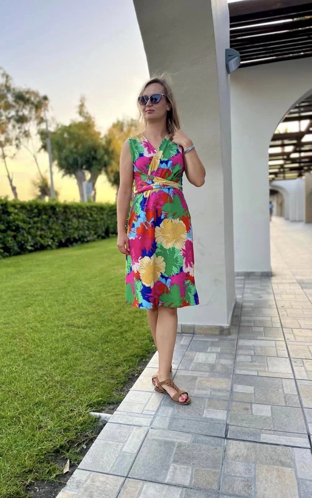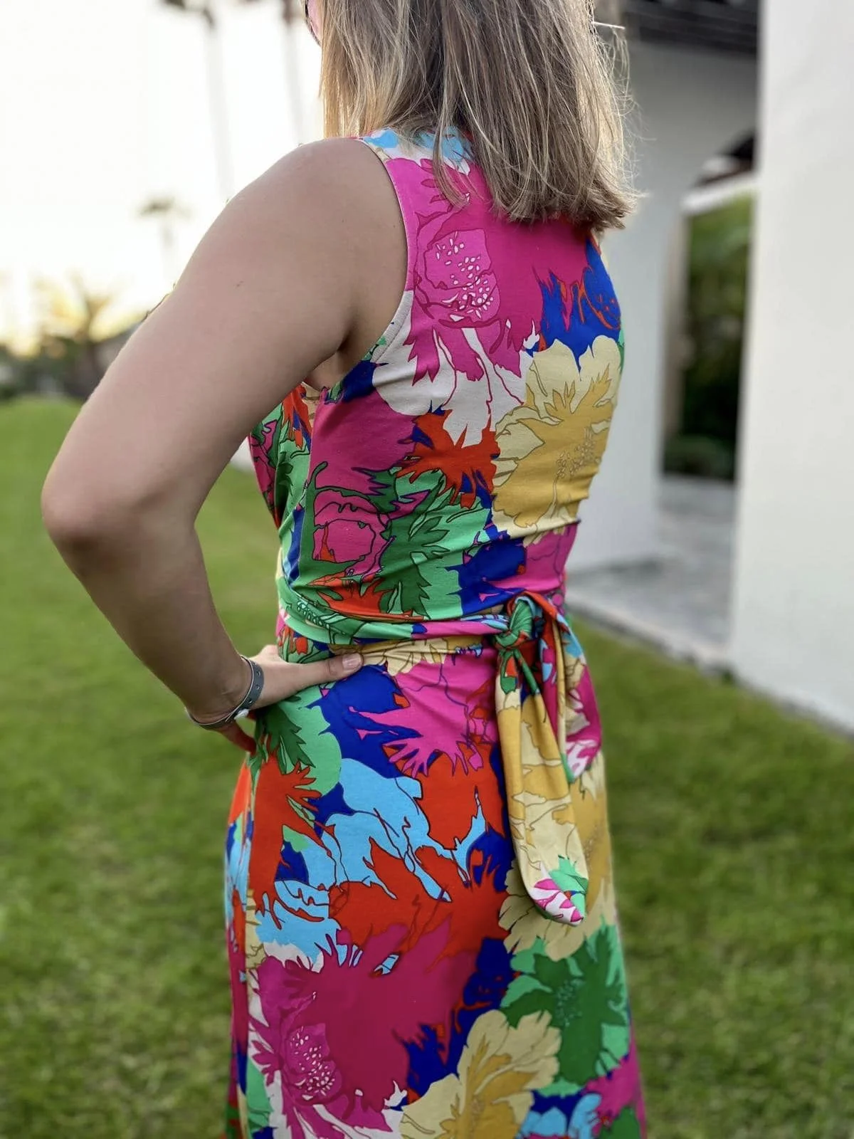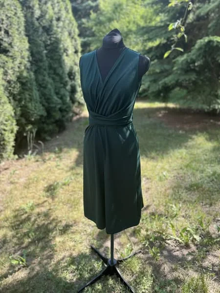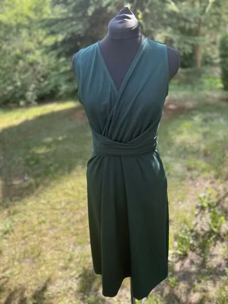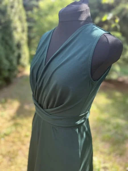 Sukienka z efektownym, modelującym sylwetkę wiązaniem przechodzącym na tył sukienki.