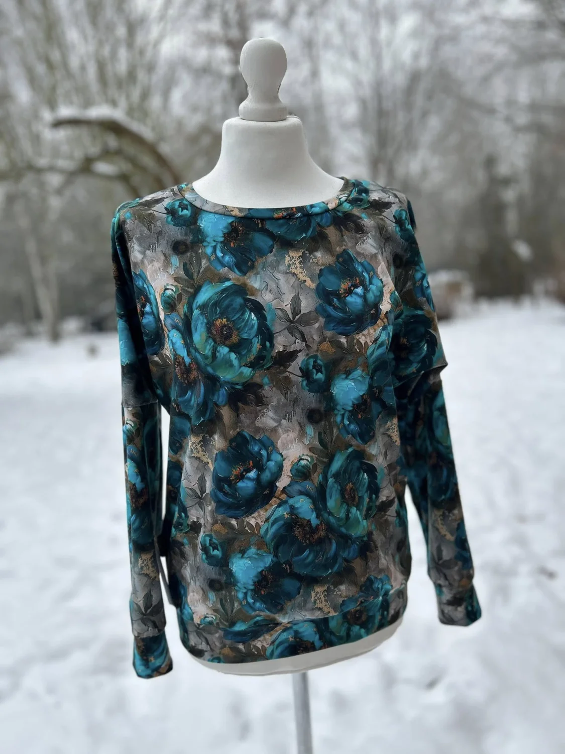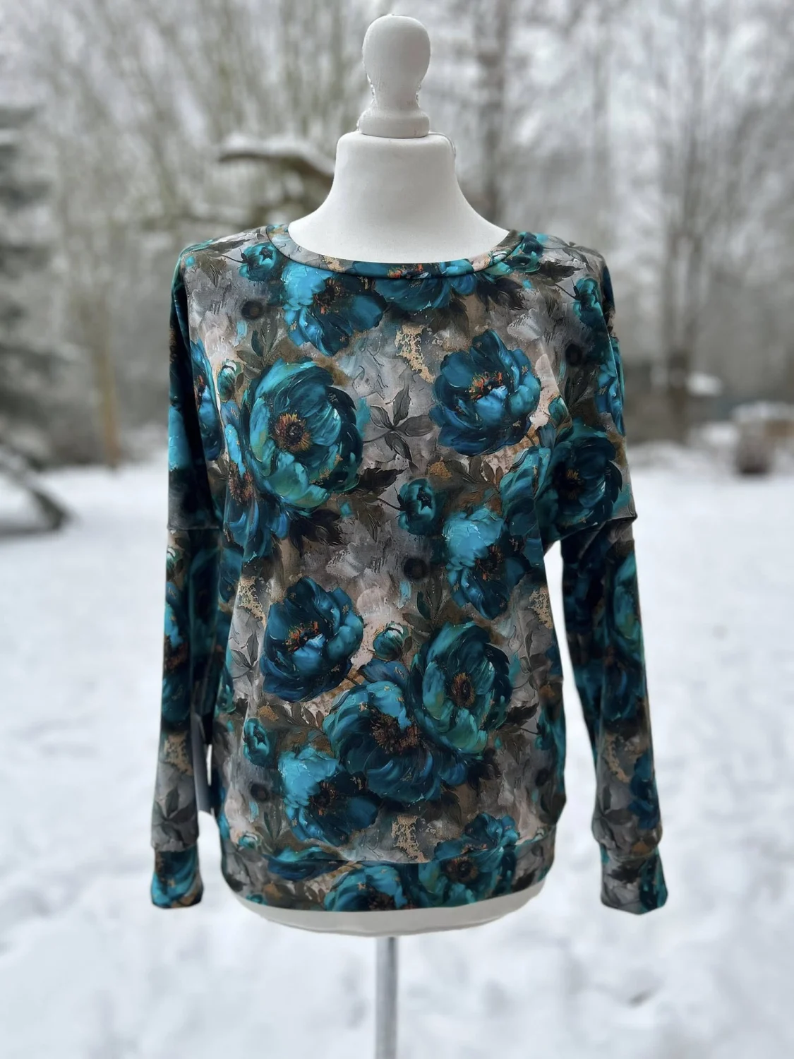 Bluza z klasycznym, okrągłym dekoltem, obniżoną linią rękawa. Do wyboru opcja z kieszeniami lub bez.